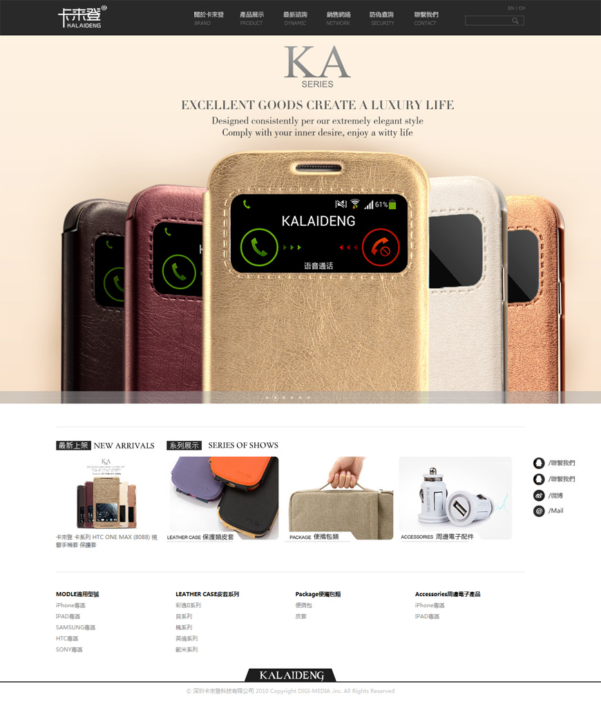 公司网站以展示产品为主,海南卡來登科技有限公司正式成立於2011年11月,是一家集研發、設計、生產、銷售於一體的綜合性集團公司。司始終秉承 “關注品質,關心客戶”的經營理念,以皮質類產品為核心,專注於3C數碼周邊保護類產品製造,是國內從事手機周邊產品研發、生產、加工的主要基地之一,屬海南市高新技術企業。